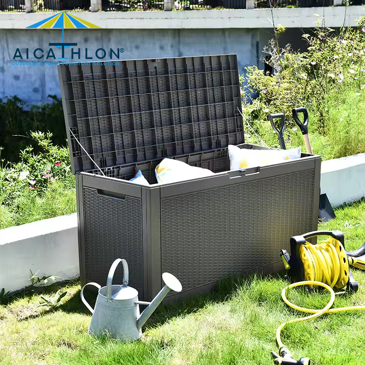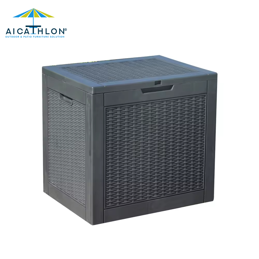 Wooden Style Waterproof Patio Resin Outdoor Pool Seating Storage Pillow Deck Box Custom